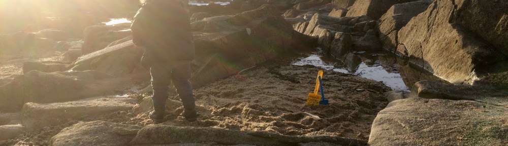 Après une première promenade et un diner sur le pouce, nous avons décidé de trouver une plage pour écrire le prénom de Paul dans le sable. J’étais tellement fatiguée par le voyage et les nuits écourtées par Aimé qui n’a pas trop apprécié le décalage horaire que j’ai pris quelques minutes pour dormir dans l’auto pendant que Patrice amenait Aimé au bord de l’eau. Me décidant enfin à aller les rejoindre, j’ai à peine eu le temps d’atteindre la plage que j’ai vu Aimé tomber alors qu’une vague remontait sur le sable, le mouillant du même coup jusqu’à la taille. Constatant ses bottes de caoutchouc remplies d’eau, j’ai photographié les lettres tracées par Patrice et Aimé en vitesse avant de devoir retraiter vers la voiture pour changer Aimé. Le temps d’aller lui acheter une paire de pantoufles pour qu’il puisse avoir les pieds au sec (parce que nous avions cru à tort qu’une paire de botte suffirait pour la journée), la marée était trop haute pour tracer de nouvelles lettres.
